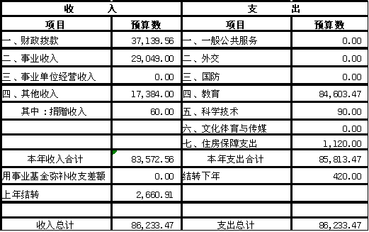 我校2014年收支总预算86,233.47万元,较上年年初部门预算72,734.44万元增加13,499.03万元,其中:财政拨款增加5,973.12万元,事业收入增加2,938万元。